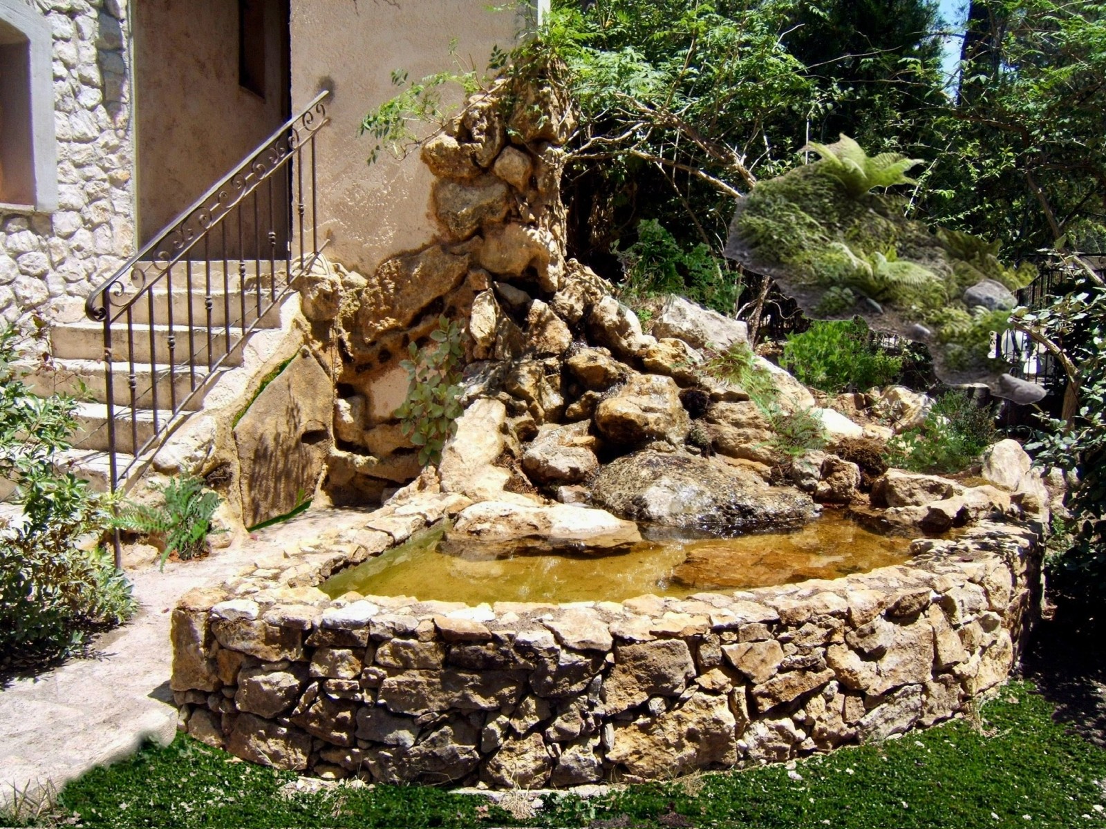 Bassin d’agrément avec torrent réalisé à Aix-en-Provence par Petitjean Paysage. Structure en béton habillée de pierres naturelles, avec jointage étanche, végétation décorative, éclairage paysager et système de filtration performant.